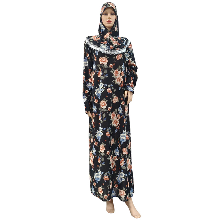 Hot Selling Muslim Women Daily Style Floral print Hijab scarf khimar Islam Turkey Middle East Long loose hooded Dress Abaya With Lace Jilbab Maxi Dresses Robe